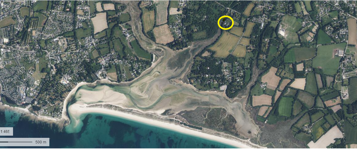Les plages de Mousterlin ( Fouesnant les Glénans) et Bénodet sont situées à 3 km environ, accessibles par sentier côtier ou route départementale (D44) , équipée de piste cyclable.