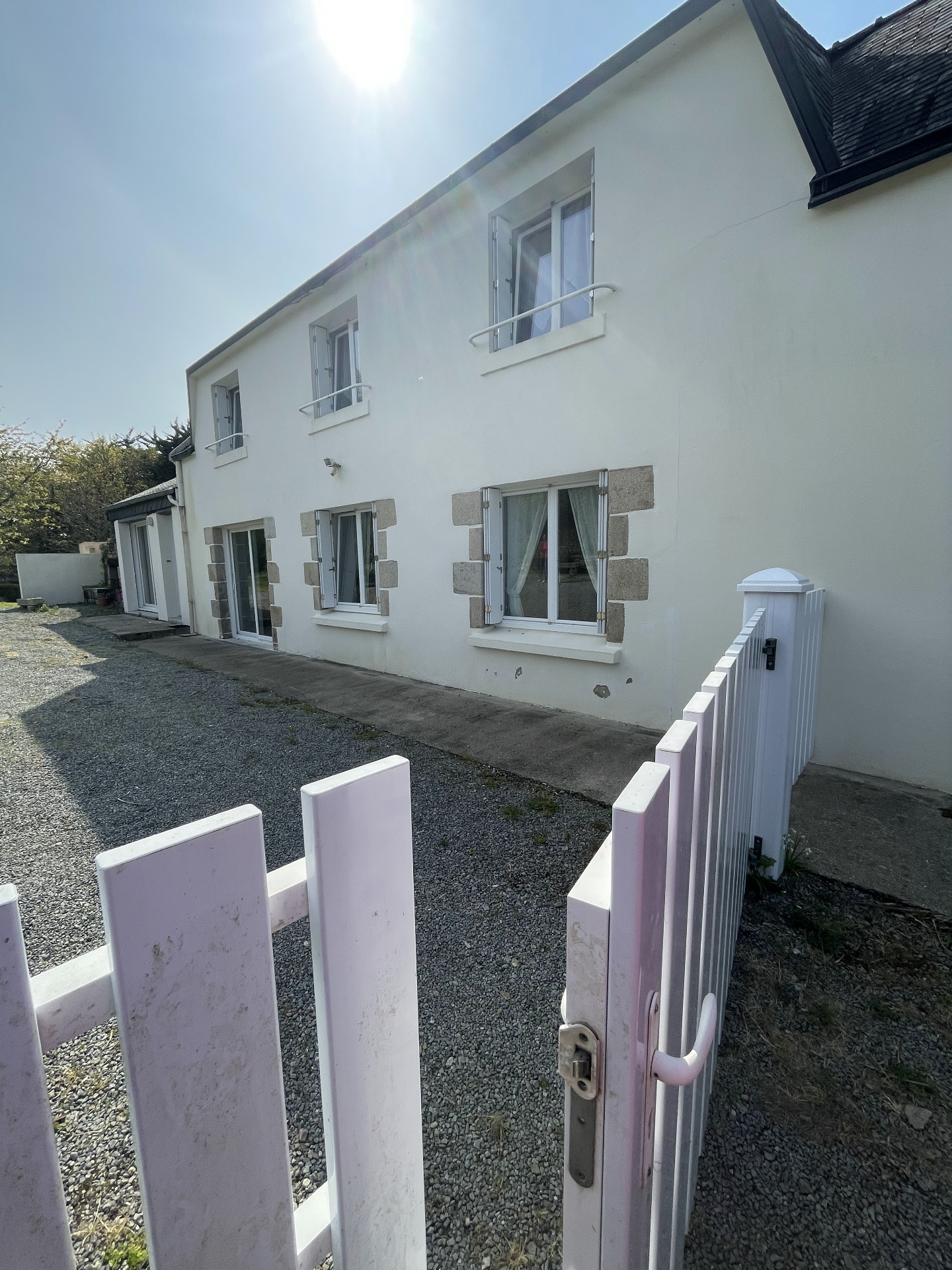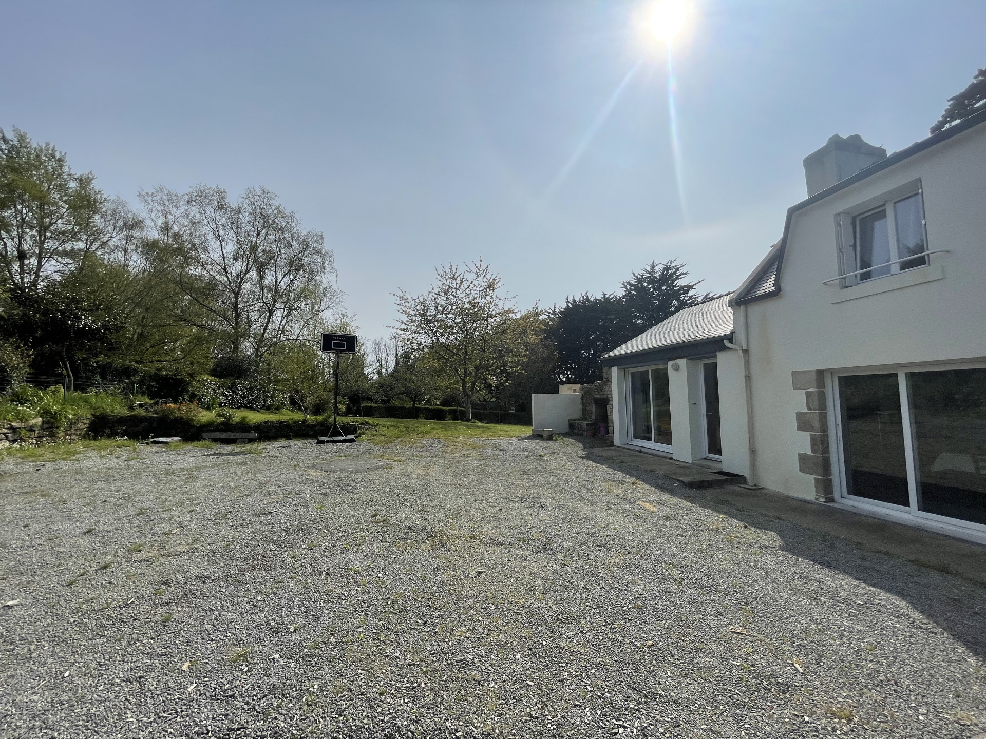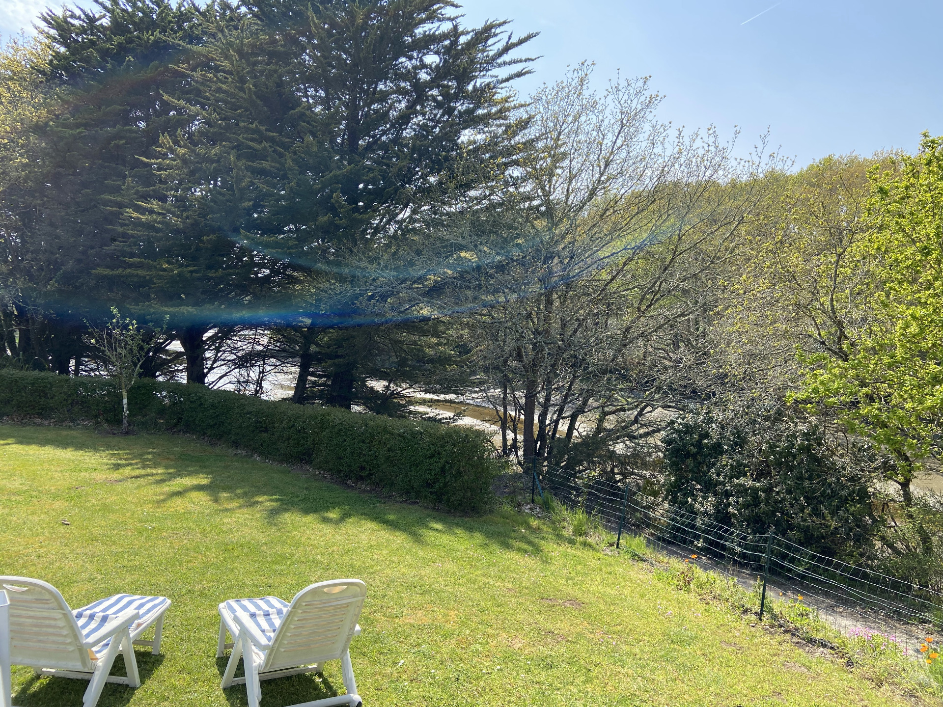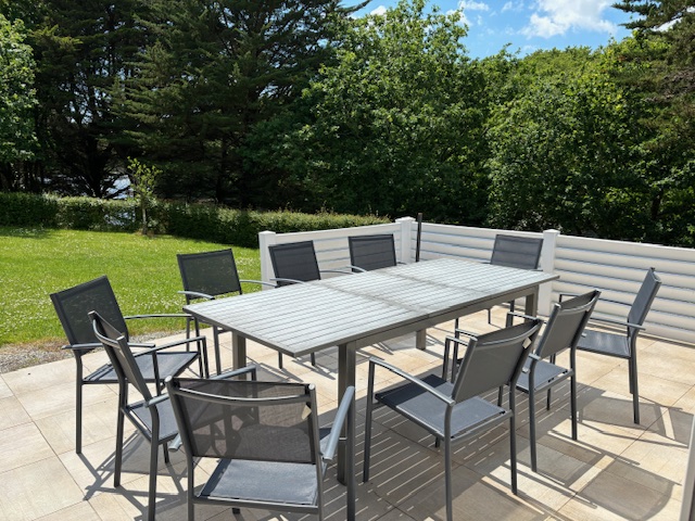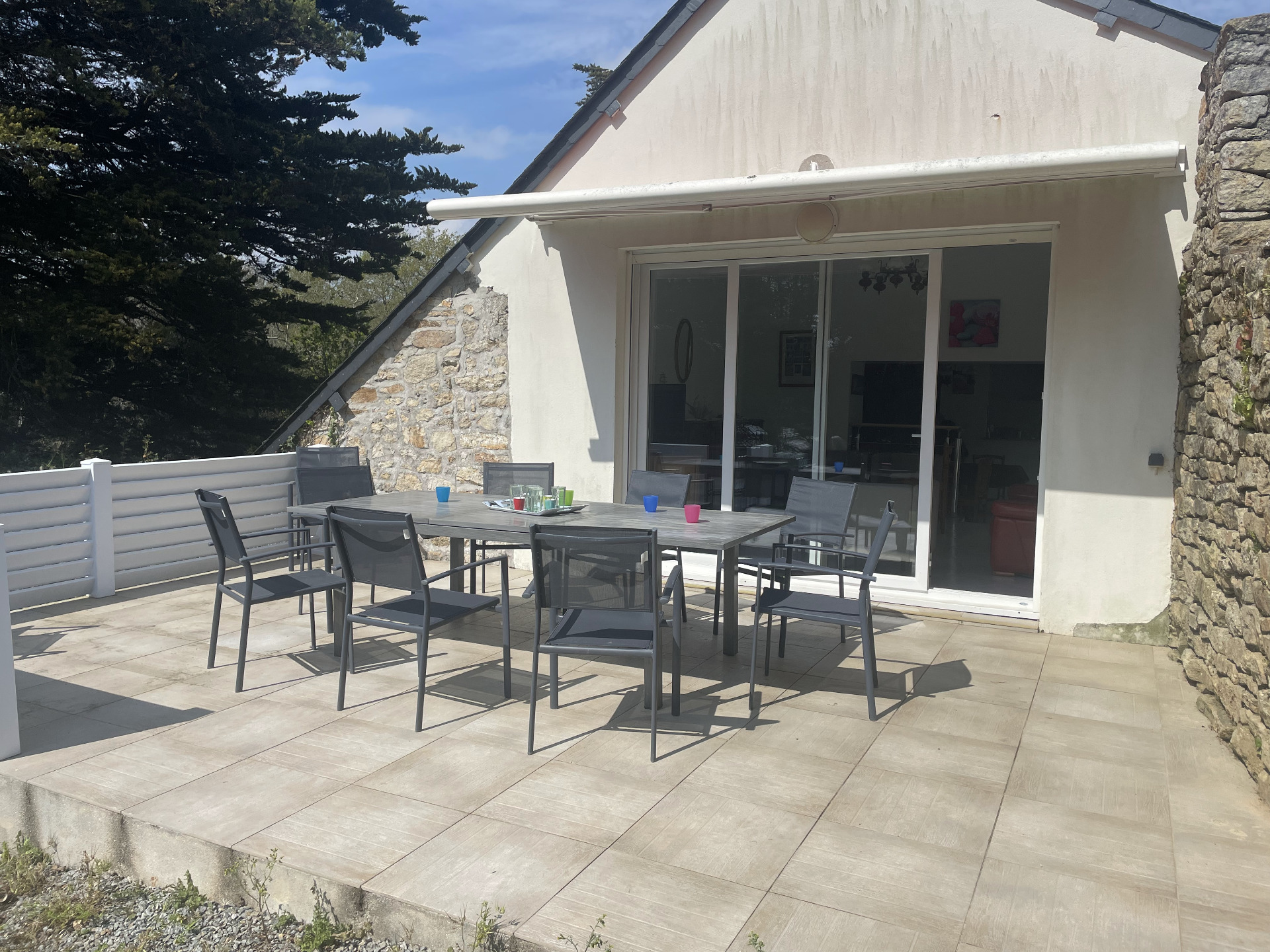 Grande terrasse avec vue jardin et bras de mer, auvent électrique