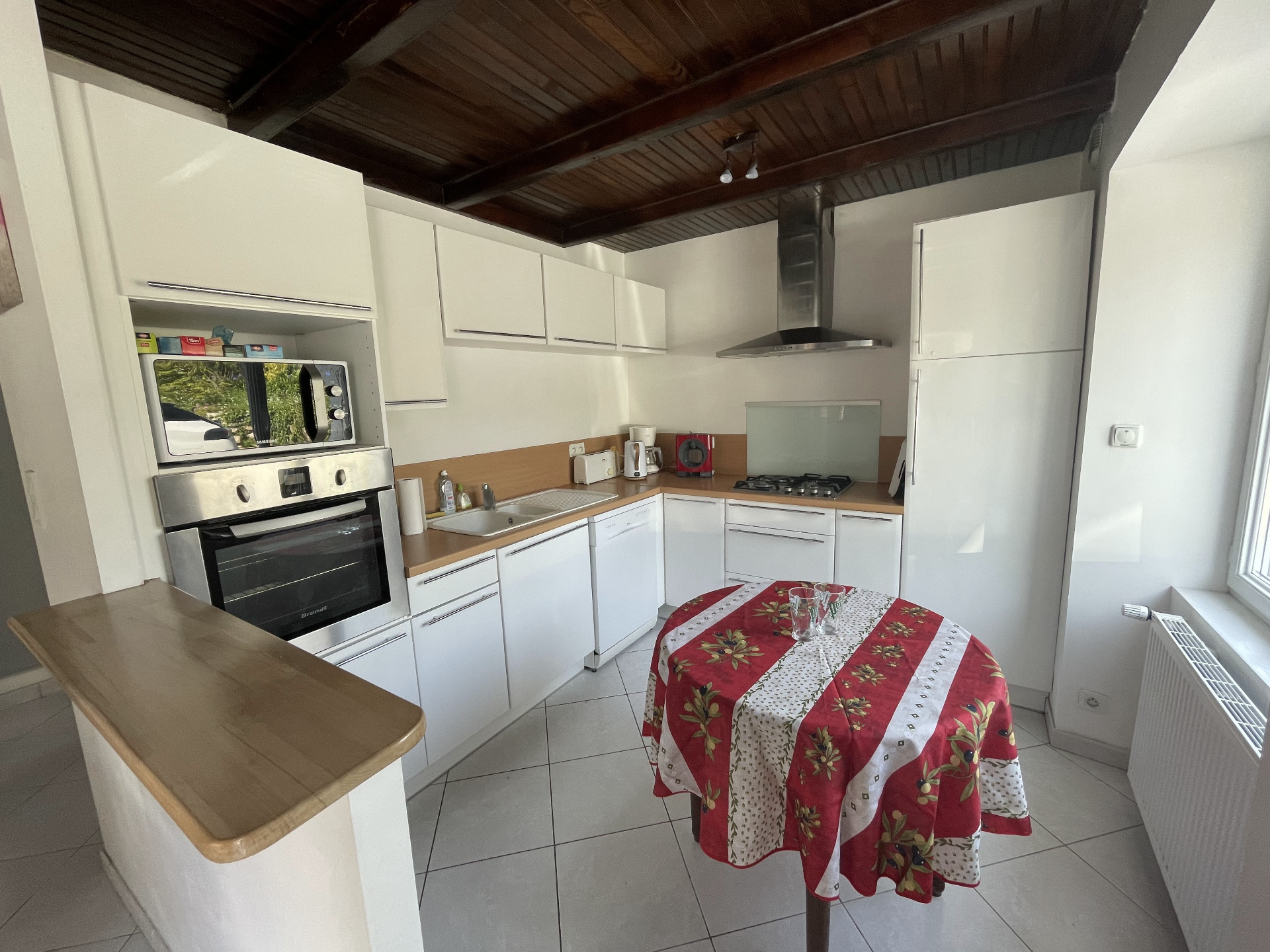 1 cuisine ouverte équipée : four, micro-ondes, réfrigérateur, cuisinière, lave-vaisselle, cafetière, grille-pain